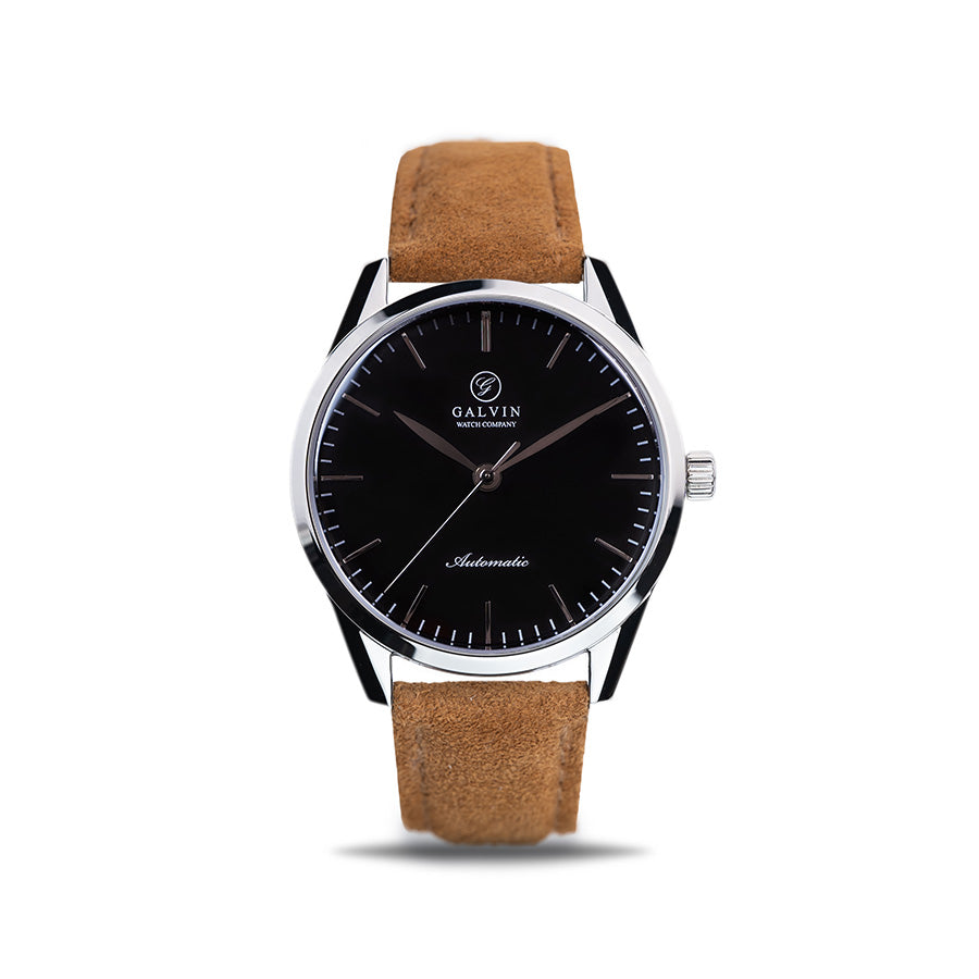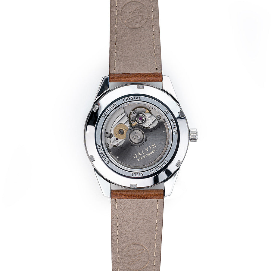 Inspired by the golden age of watchmaking, the Alku Collection features a domed sapphire crystal and classic indexes. The transparent case back reveals the Miyota 9039 Calibre, showcasing its beauty. The distinctive Nordic design reflects the vision of Susan Galvin, the founder of Galvin Watch Company.