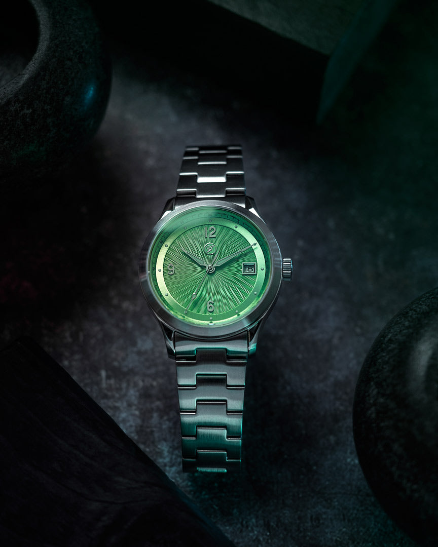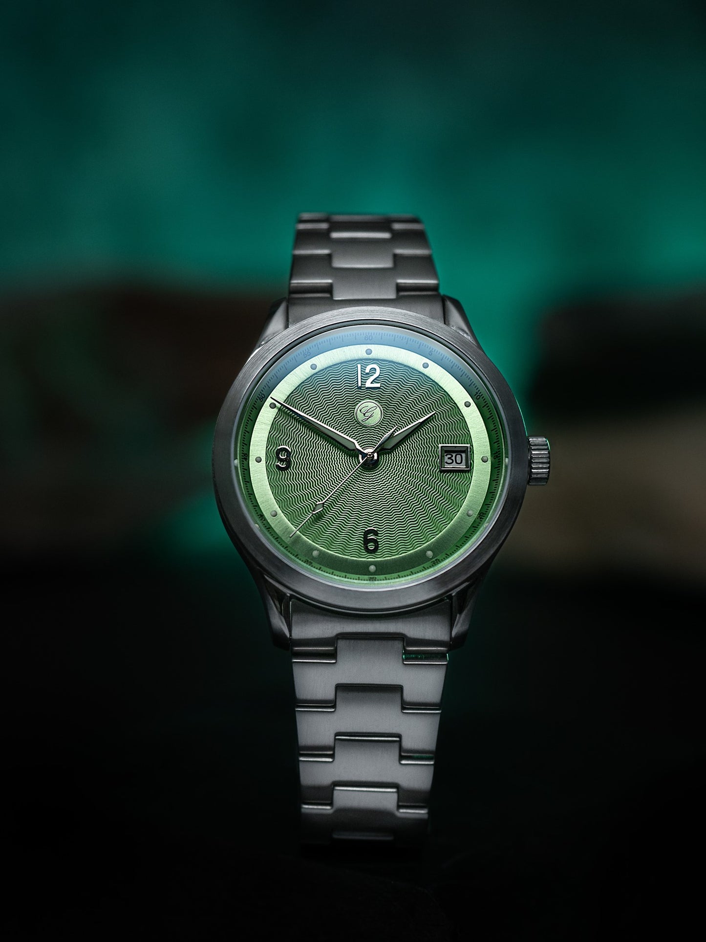 Loimu*, the second collection from Galvin Watch Company, showcases an automatic movement with a date window. Crafted by industry accredited watchmaker Susan Galvin, this collection celebrates her northern Finnish roots. The guilloché-style dials beautifully reflect the radiant aurora borealis of the northern night sky.