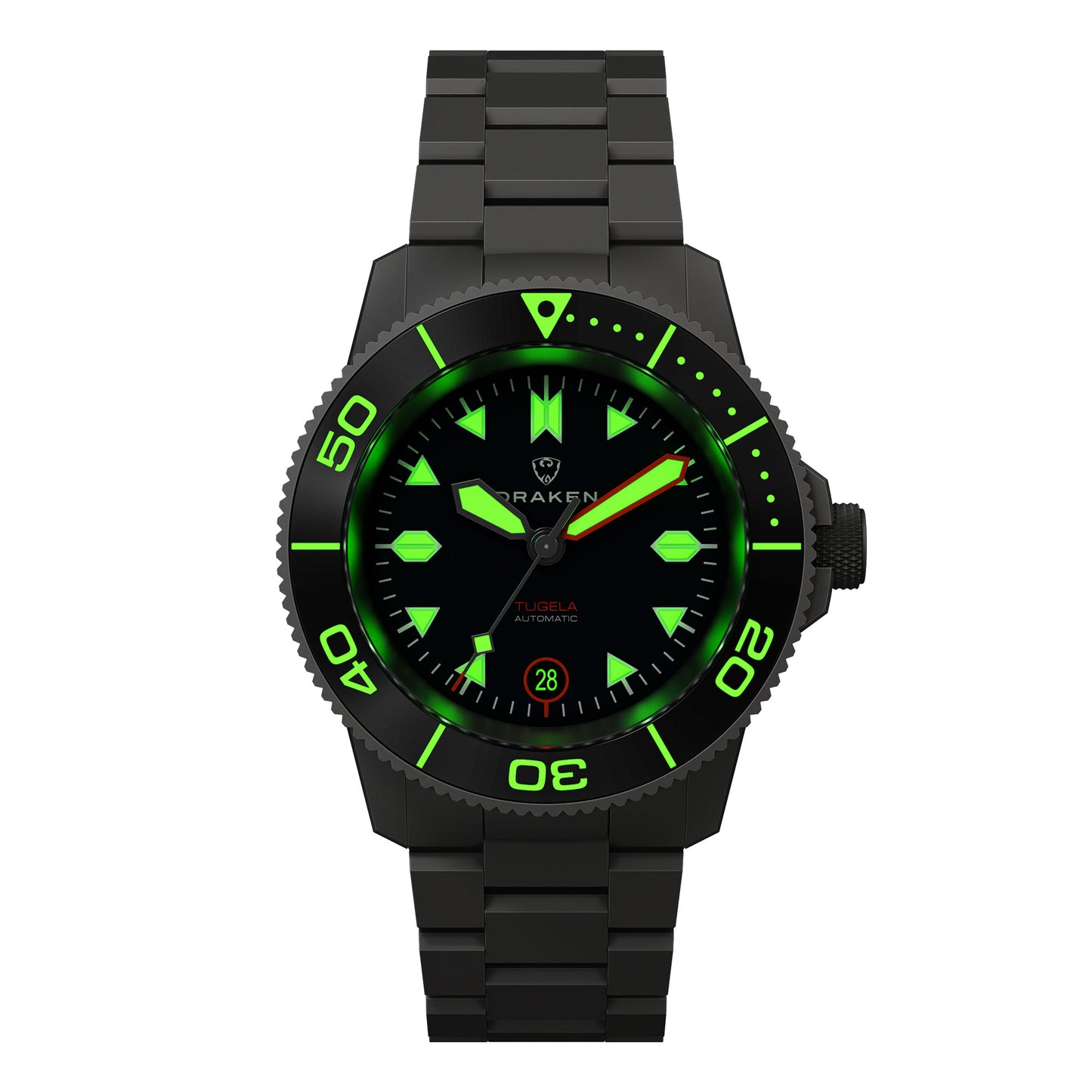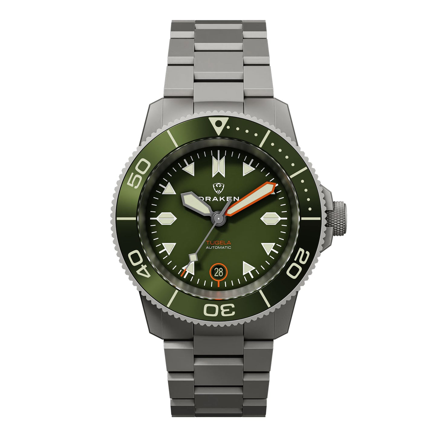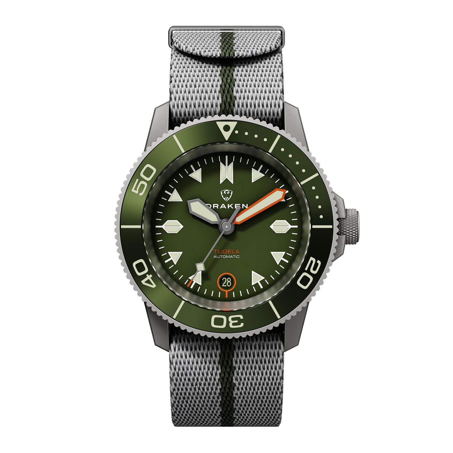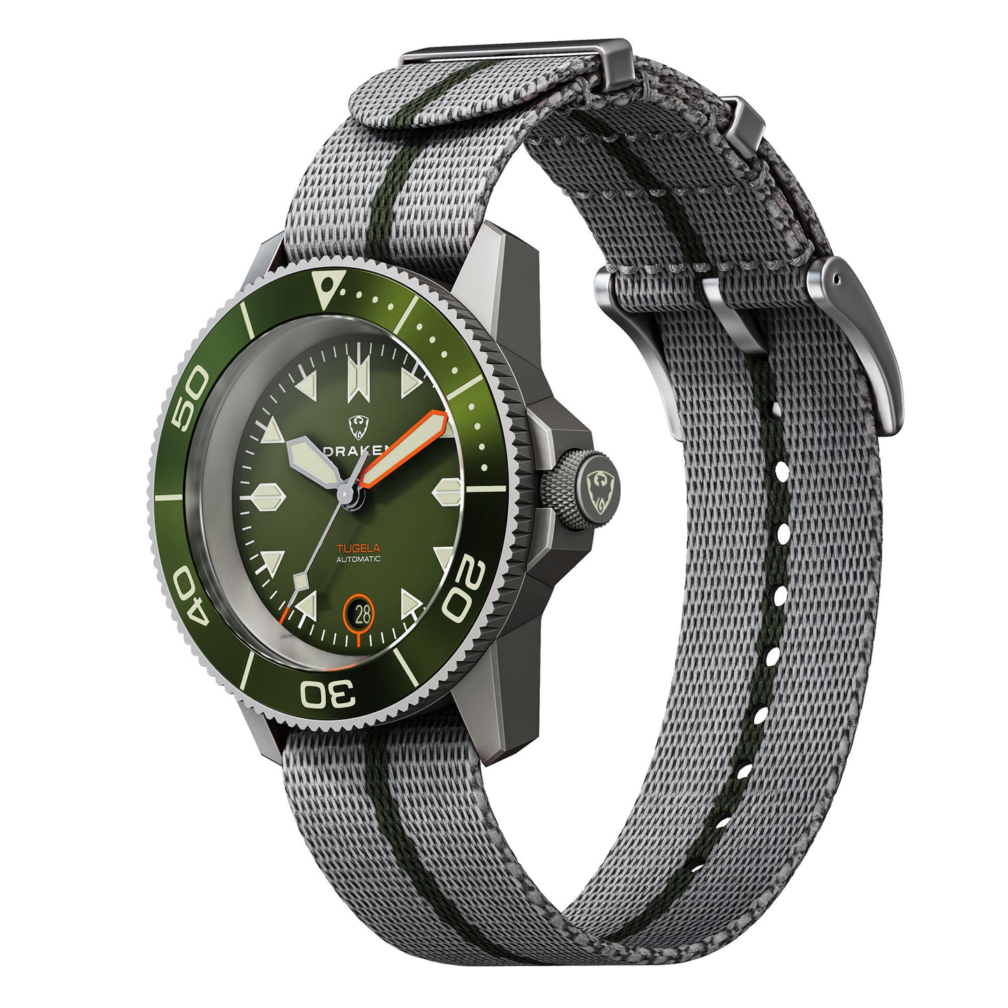 Draken Watches presents their iconic 300m water-resistant timepiece, meticulously designed for precision timing on both land and sea. The tall bezel offers ample grip while seamlessly blending with the overall case design. The 120-click unidirectional bezel delivers a crisp, satisfying click with no play.