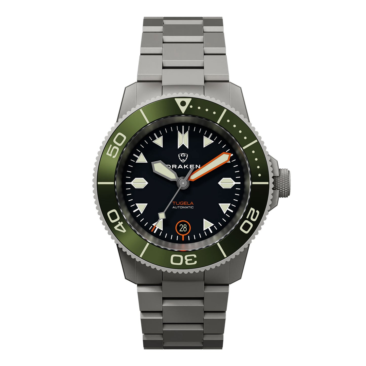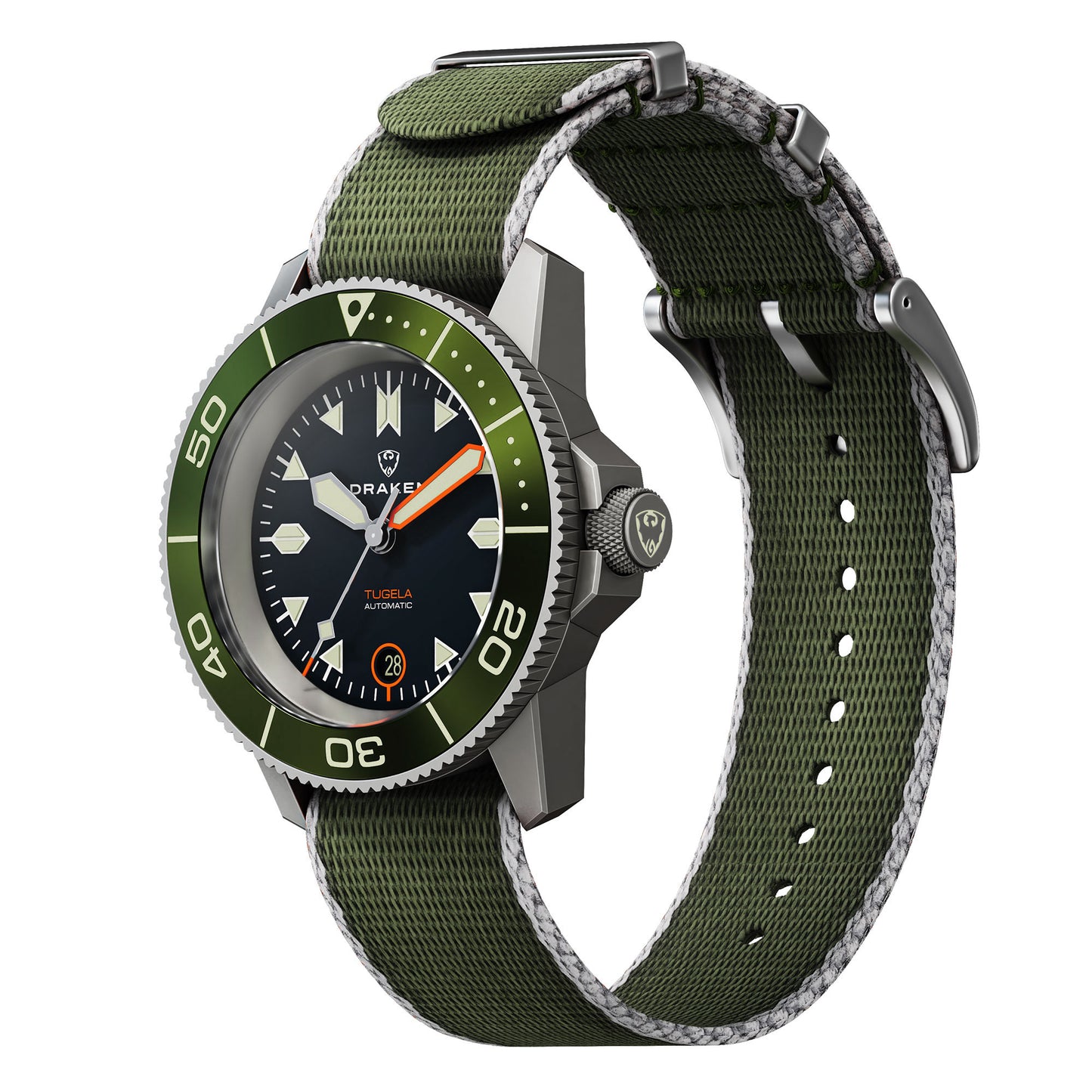 Draken Watches presents their iconic 300m water-resistant timepiece, meticulously designed for precision timing on both land and sea. The tall bezel offers ample grip while seamlessly blending with the overall case design. The 120-click unidirectional bezel delivers a crisp, satisfying click with no play.
