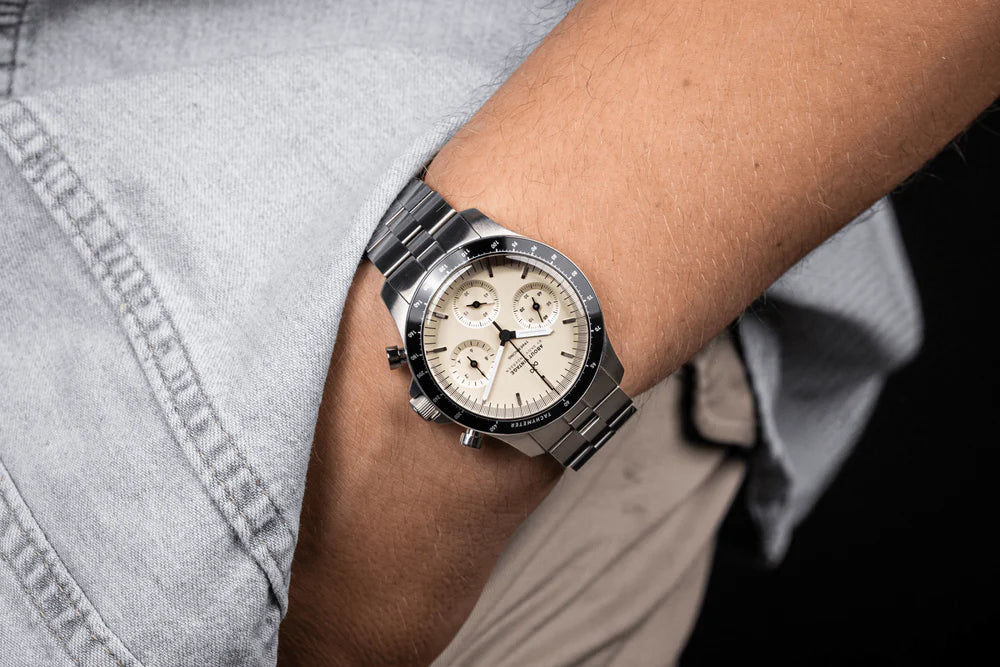 Its design strikes a perfect balance between vintage charm, sleek 80s Bauhaus lines, and modern technology. This 40mm sports chronograph features a tachymeter, a scratch-resistant sapphire crystal with anti-reflective coating, and a durable 316L surgical steel case.
