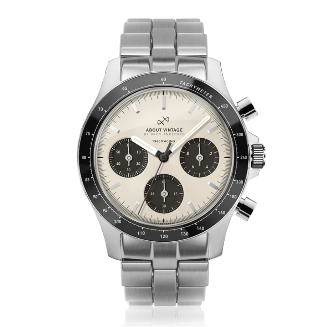 Its design strikes a perfect balance between vintage charm, sleek 80s Bauhaus lines, and modern technology. This 40mm sports chronograph features a tachymeter, a scratch-resistant sapphire crystal with anti-reflective coating, and a durable 316L surgical steel case.