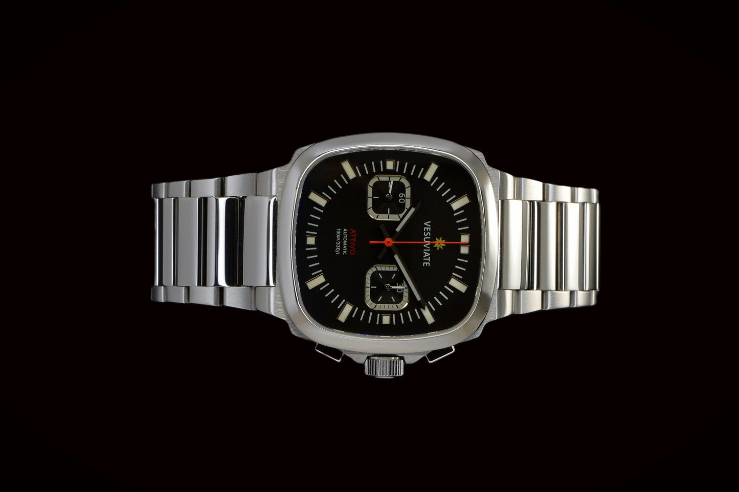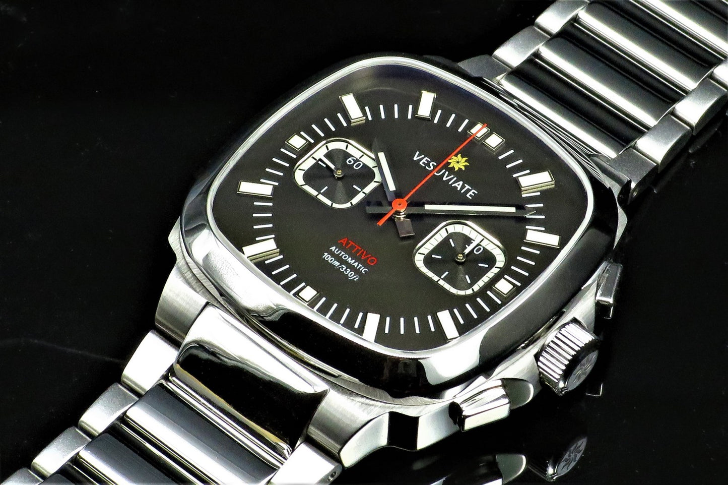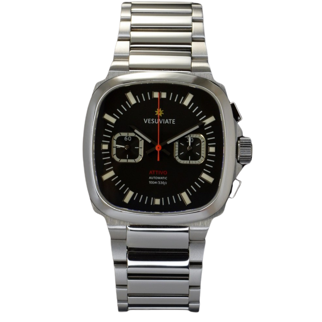 VESUVIATE Attivo-Chrono, 100m/330ft – Powered by the Seagull ST-1940 caliber (also known as Venus 175), this tool-watch boasts a stainless steel case and bracelet with a super-hard, case-hardened surface treatment. Featuring a rugged design and an automatic column-wheel chronograph movement, it combines affordability, durability, and timeless appeal.