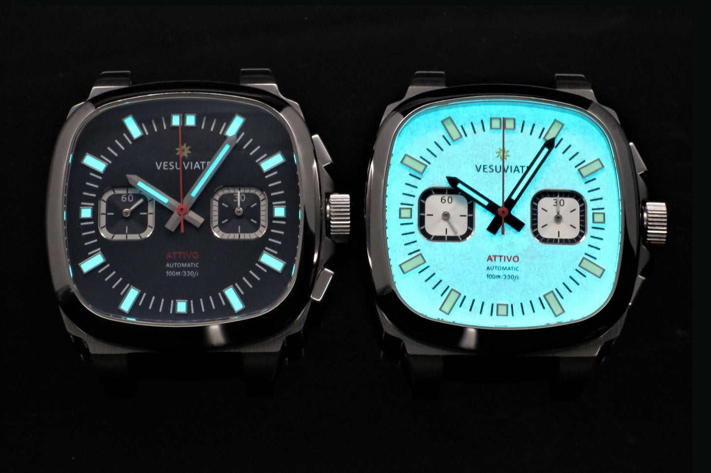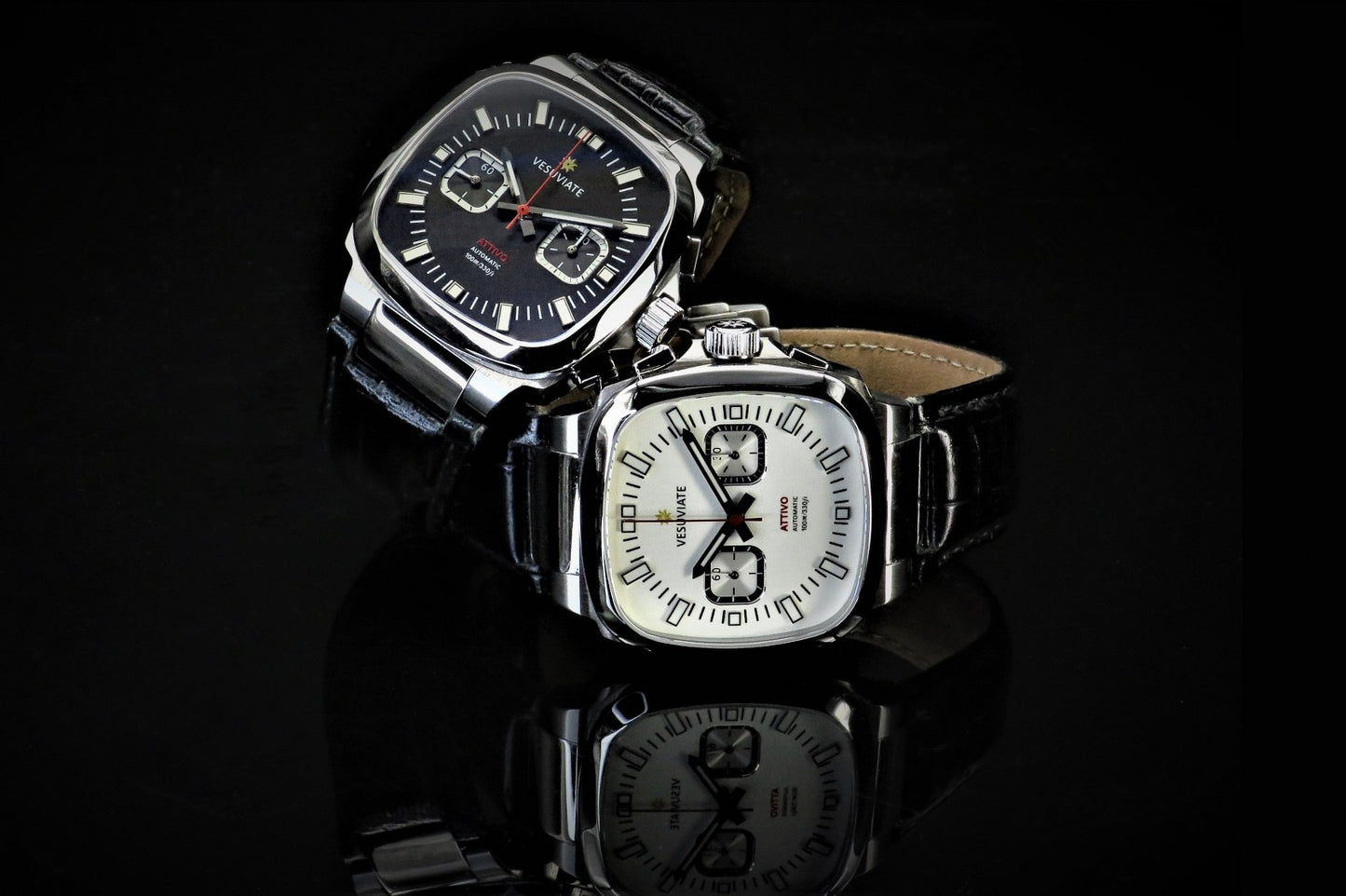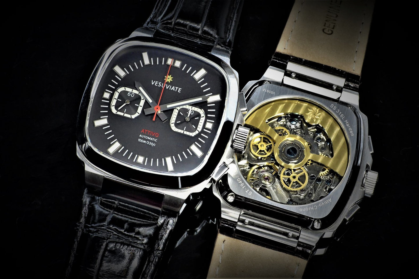 VESUVIATE Attivo-Chrono, 100m/330ft – Powered by the Seagull ST-1940 caliber (also known as Venus 175), this tool-watch boasts a stainless steel case and bracelet with a super-hard, case-hardened surface treatment. Featuring a rugged design and an automatic column-wheel chronograph movement, it combines affordability, durability, and timeless appeal.