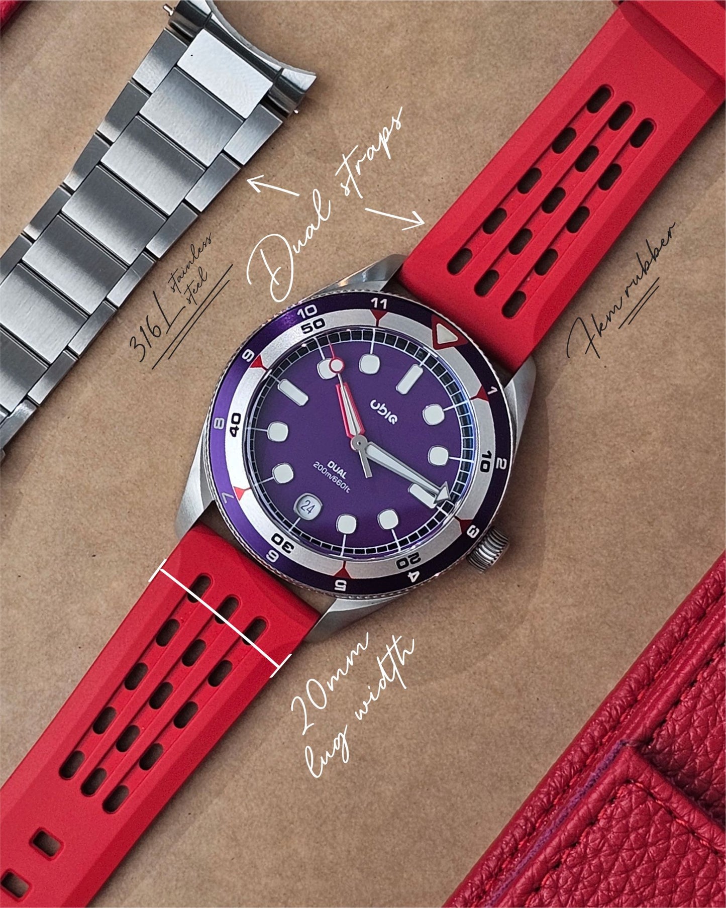 Bracelet/Strap: Brushed flat link stainless steel quick-release screw pin bracelet (20mm to 16mm taper) with on-the-fly micro-adjust clasp and colour-matched quick-release FKM rubber strap