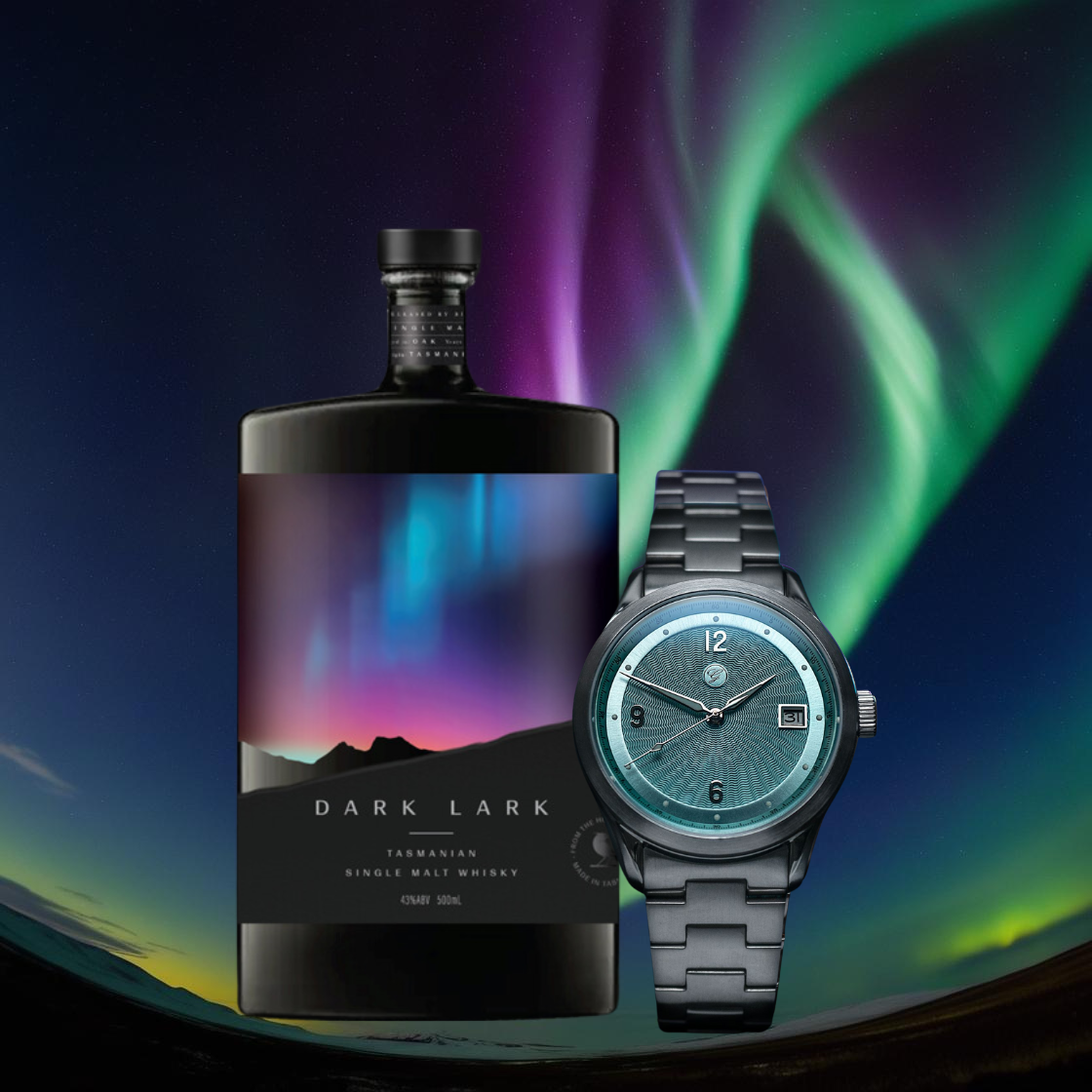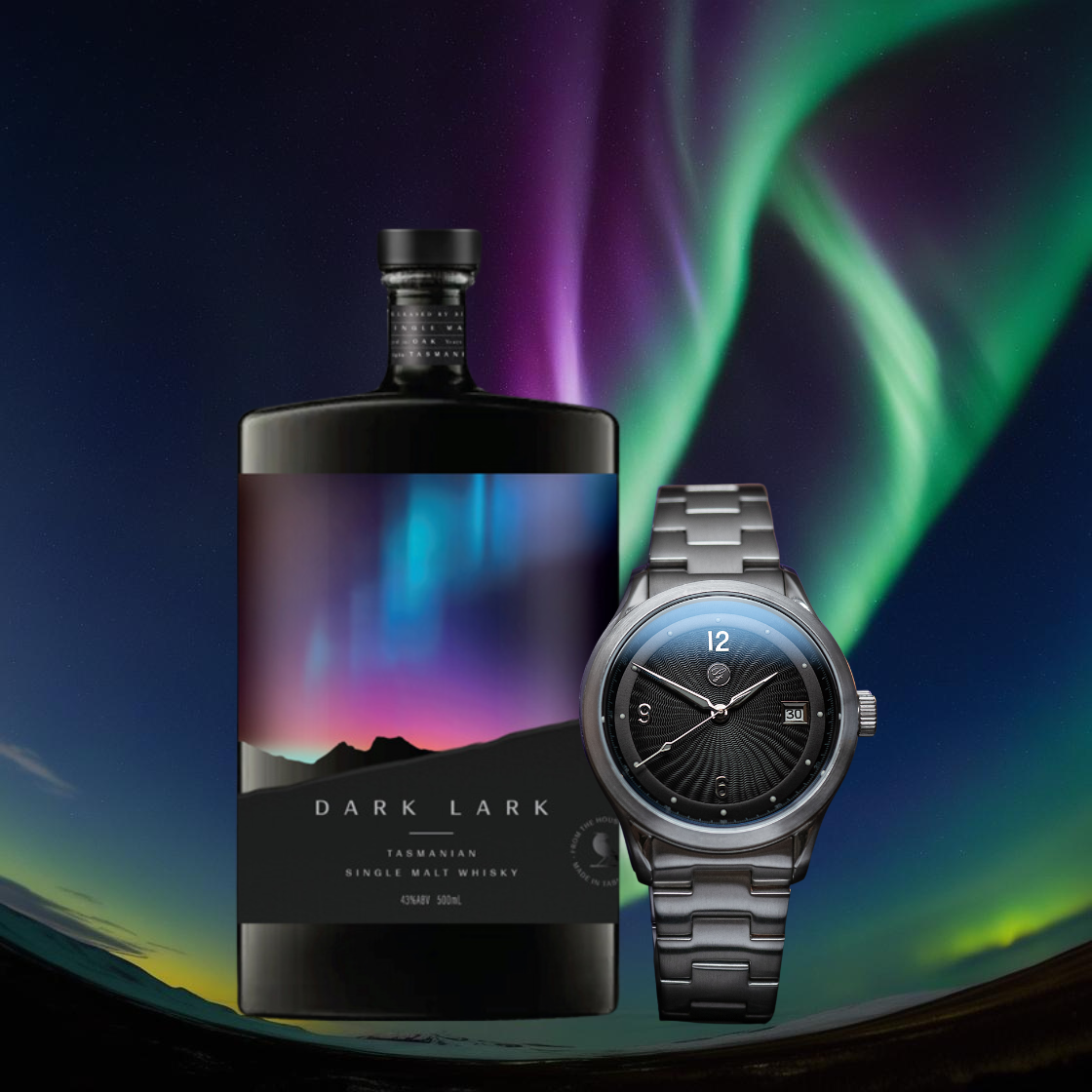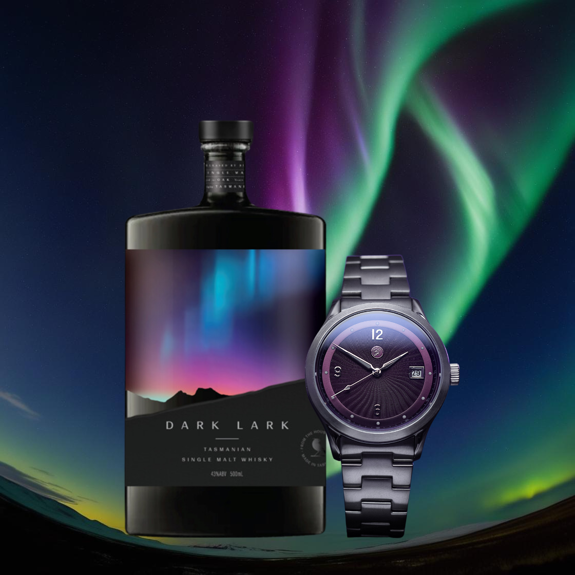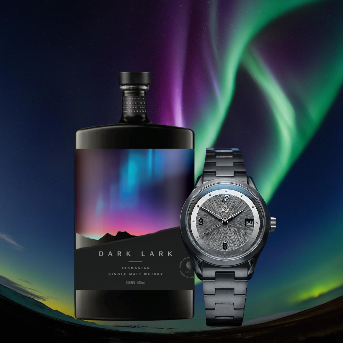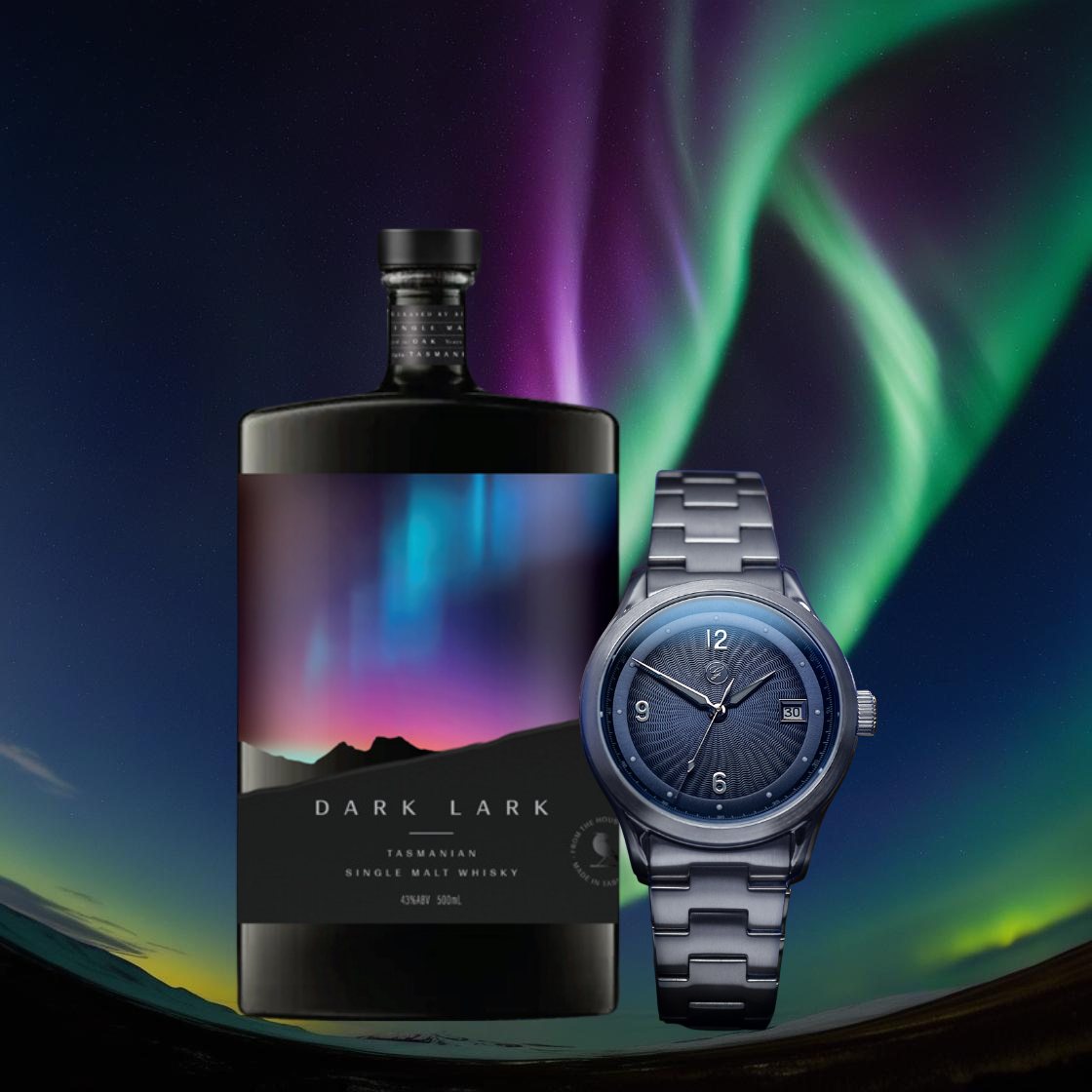 From the blazing Aurora Borealis of Finland to the luminous Aurora Australis of Tasmania, the Loimu Collection by Galvin Watch Company and DARK LARK Single Malt Whisky capture the wonder of the night skies. Celebrate heritage and craftsmanship with a guilloché dial inspired by the northern lights, paired with the ultra-smooth warmth of spiced oak and caramelized pineapple. A perfect harmony of time and taste—made to shine, made to share.