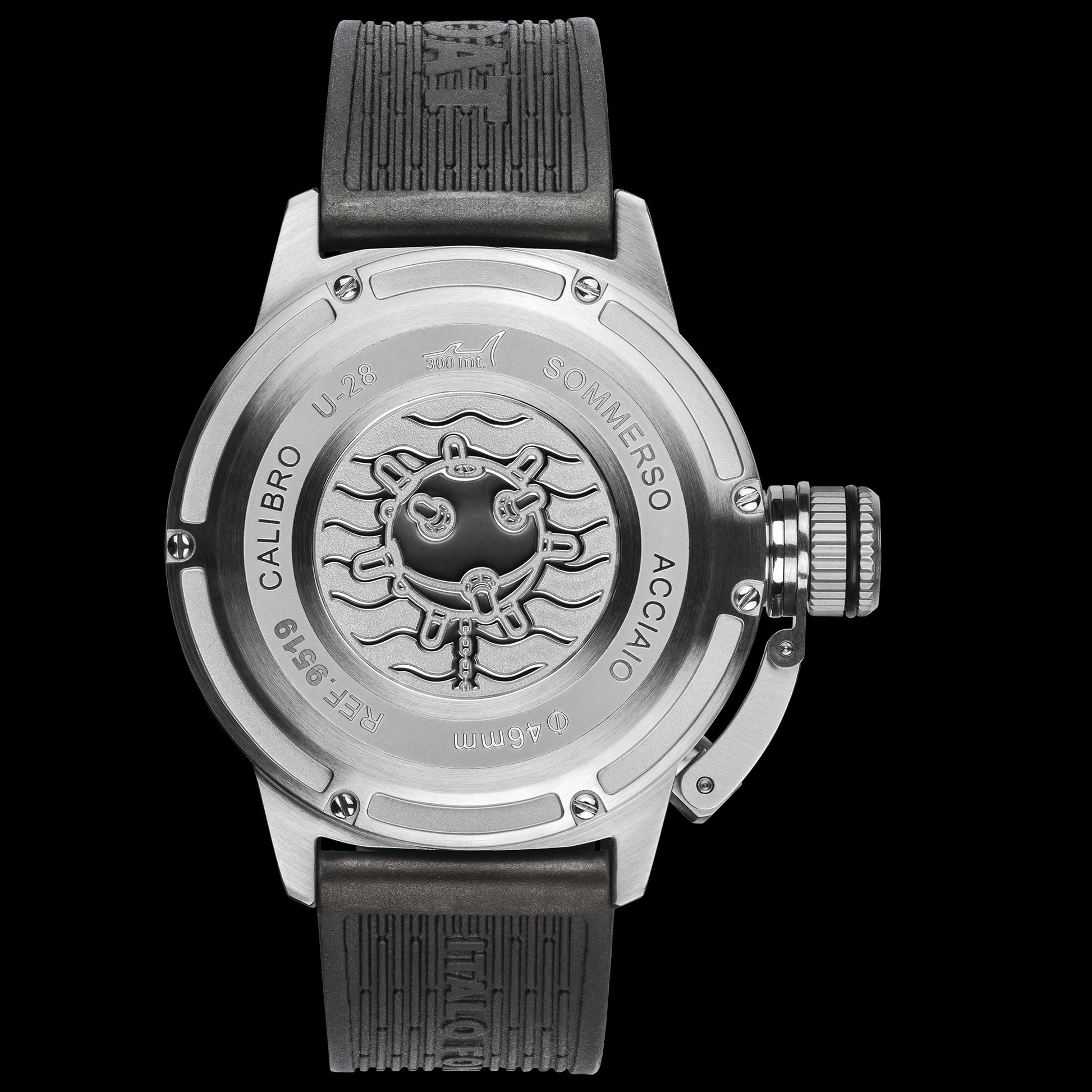 Sellita SW 200 swiss automatic mechanical, personalized to U-BOAT specifications. Frequency: 28,800 vibrations per hour, 4 Hz. Power reserve: 41 hours. 26 jewels. Skeletonized rotor.