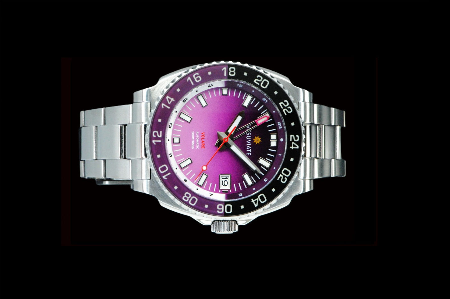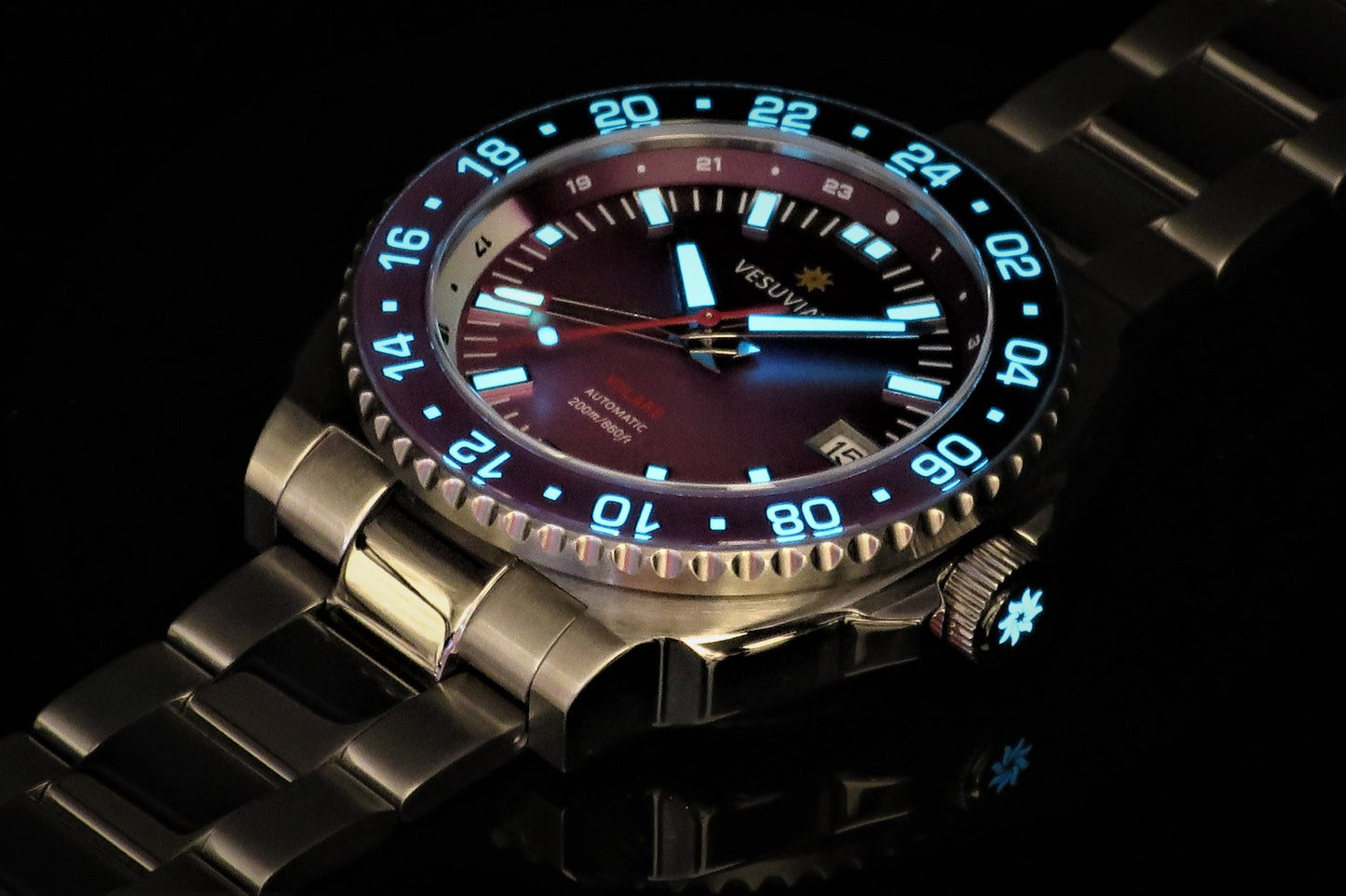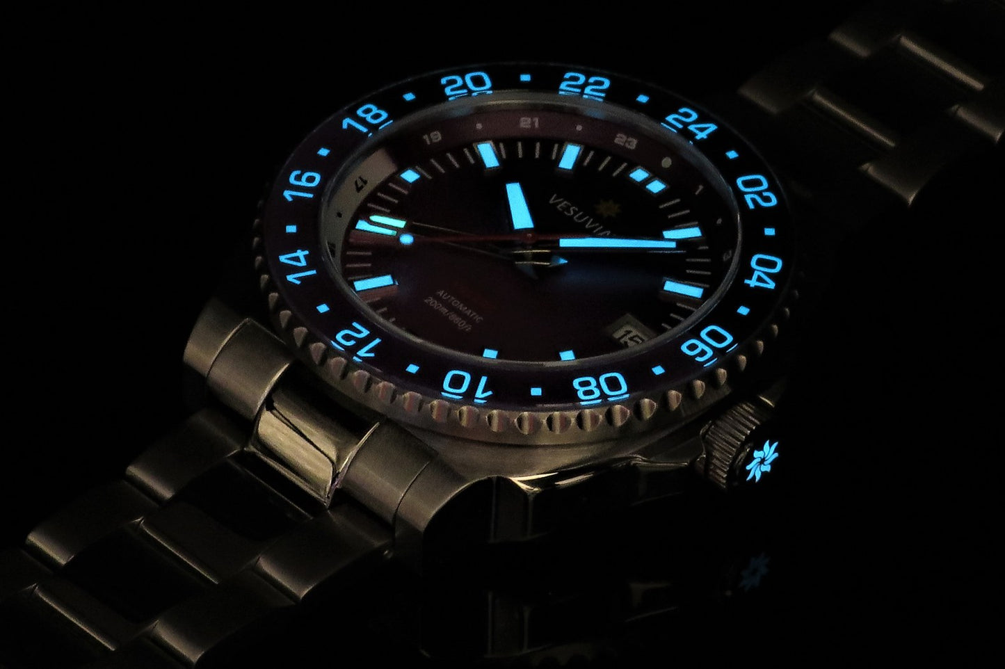 VESUVIATE VOLARE, 200m/660ft – Equipped with the Seiko NH34A (also known as 4R34) movement, this tool-watch features a 316L stainless steel case and bracelet with a super-hard, case-hardened thermochemical treatment. A robust and durable timepiece with a Japanese automatic movement, offering affordability, longevity, and timeless style.
